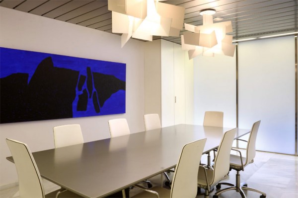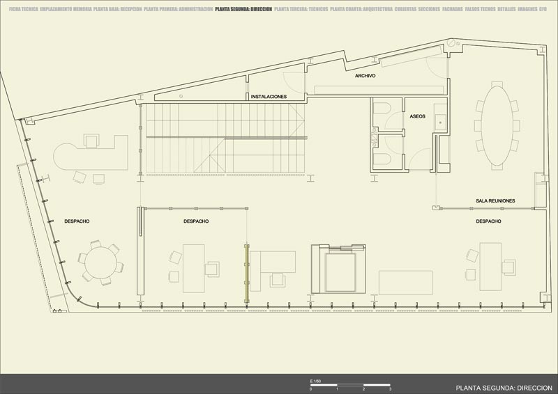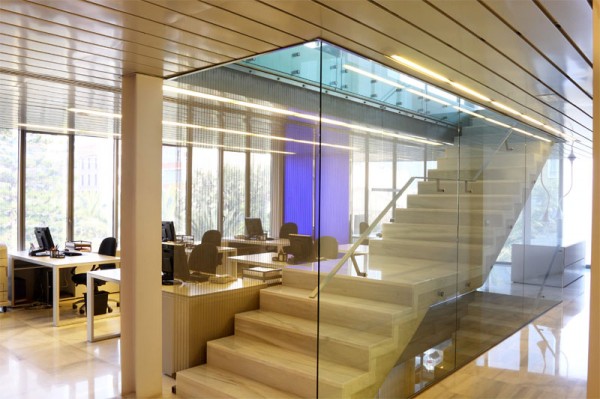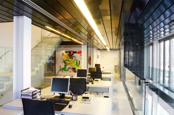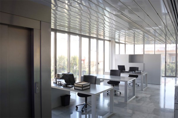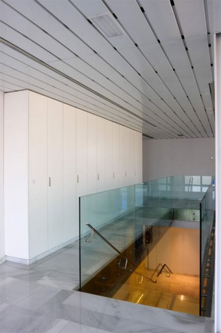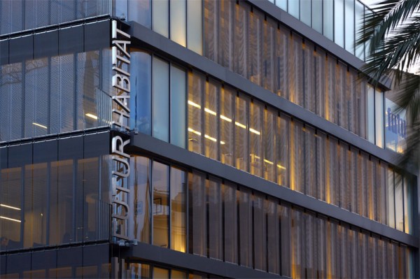 Los lugares de trabajo se sitúan en varias plantas combinando espacios abiertos y otros cerrados dispuestos en los ámbitos libres, fruto de la concentración de los espacios sirvientes. La fachada acristalada, de color gris mate con mecanismos de protección de mallas de acero inoxidable, permite la transparencia sin deslumbramiento, produciendo efectos que varían según las condiciones climáticas o la intensidad de la luz del día.