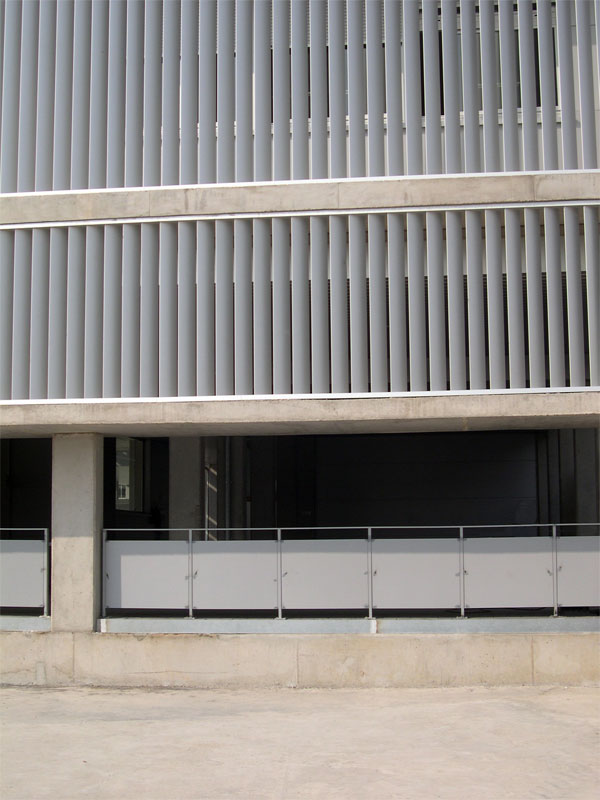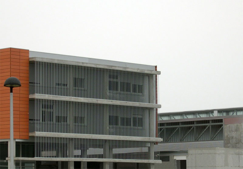 Los materiales empleados en su construcción son el hormigón visto de modo genérico y para las plantas superiores del aulario, una fachada ventilada realizada con piezas de cerámica extruída tipo “bardeaux”.