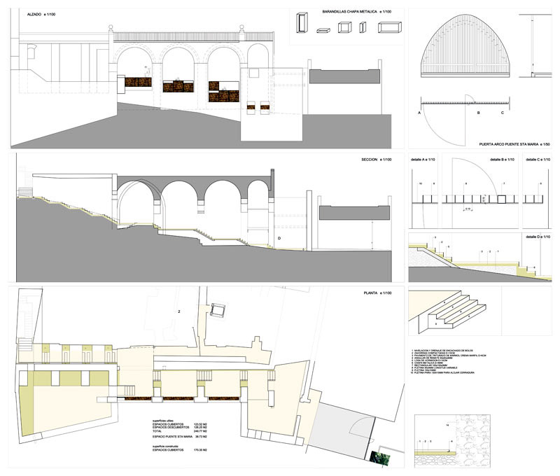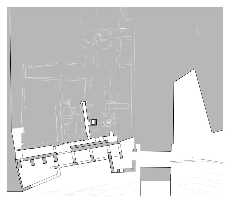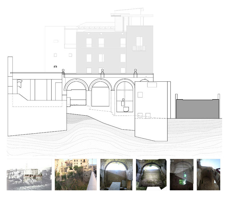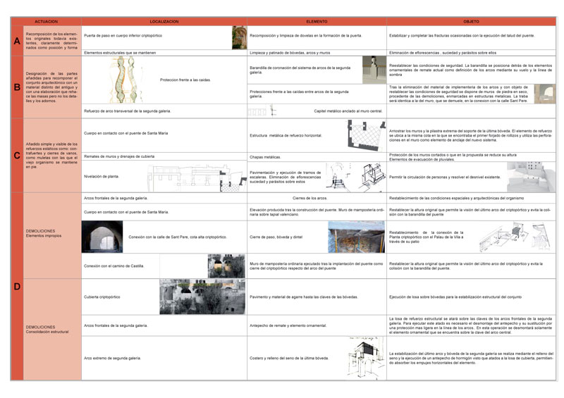 Antes de finalizar los trabajos de rehabilitación del Palau de la Vila, el catorce de Julio de dos mil nueve, recibimos el encargo de proyectar la consolidación del Criptopórtico. El objetivo consistía en detener el proceso de deterioro con la intención de recuperar este interesante conjunto. La intervención consistió en la limpieza de los elementos añadidos sin interés, el cosido de los muros agrietados y en el atado de todo el conjunto mediante la realización de una losa de hormigón en el nivel de la cubierta. Una vez el organismo estabilizado se adecua su interior para recuperar el itinerario que une el patio del Palau y su ascensor con el antiguo camino de Castilla a través del badén del río.