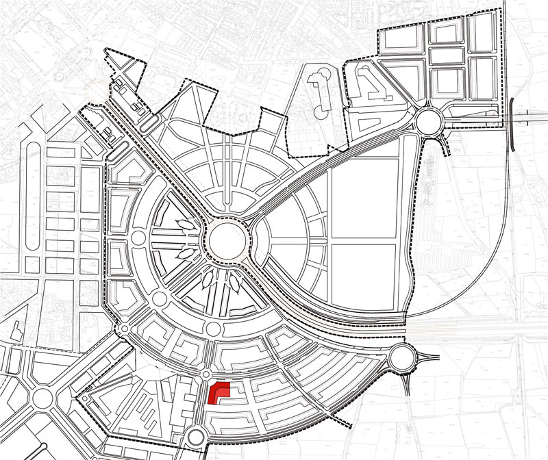 El edificio ocupa la esquina de una manzana en el ámbito del Parc Central de la ciudad de Torrent. Las alineaciones que el planeamiento establece se originan a partir del crecimiento circular de la rotonda central de tráfico; así la geometría de las parcelas adopta la forma de rectángulos de lados curvos, una simple retícula en crescent, que en su división presenta viviendas con fachadas de anchos diferentes.