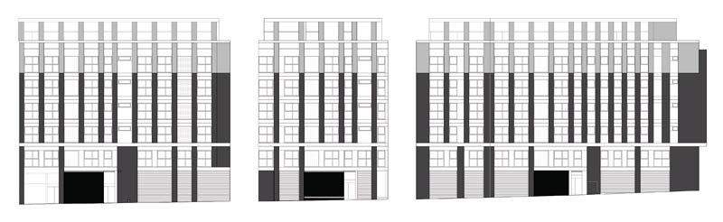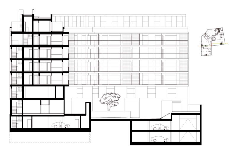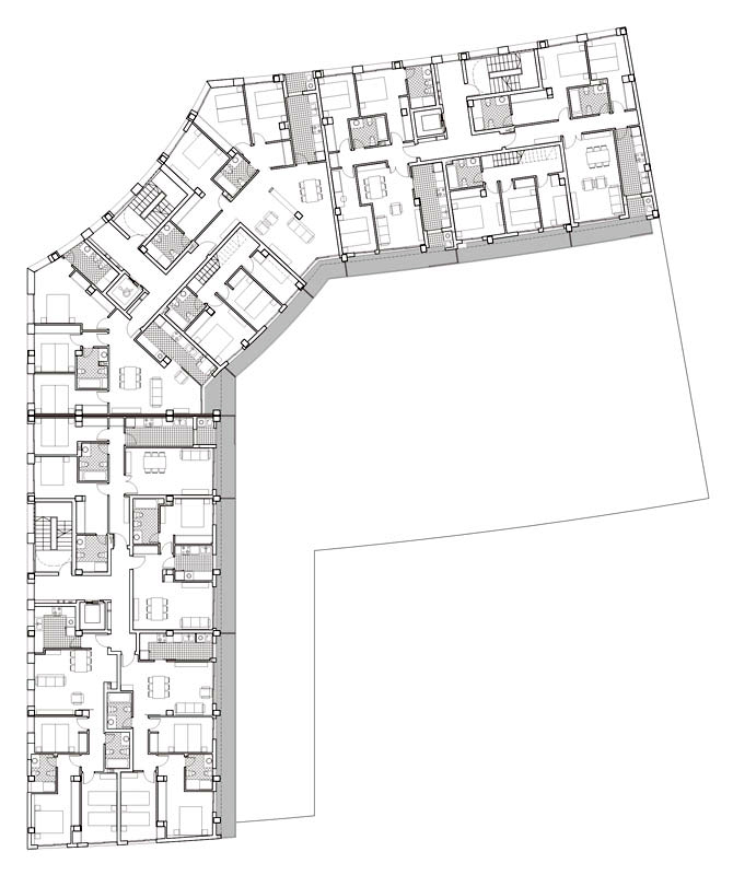 Nuestro edificio incorpora un fragmento del espacio libre interior de la manzana, desde el que se accede a todas las viviendas. La profundidad del bloque permite la obtención de viviendas pasantes. Para la materialización del edificio se utiliza una combinación de piedra arenisca y estuco.