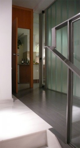 Los otros dos niveles, conectados por la escalera, se organizan y configuran alrededor de los cerramientos acristalados del vacío del patio. El último nivel, la cubierta plana, está servido por una escalera abierta. Mientras en los fríos días de invierno este espacio actúa como una extensión de la casa, durante la canícula se puede permanecer en la planta baja en la que el patio ofrece una adecuada iluminación y ventilación.